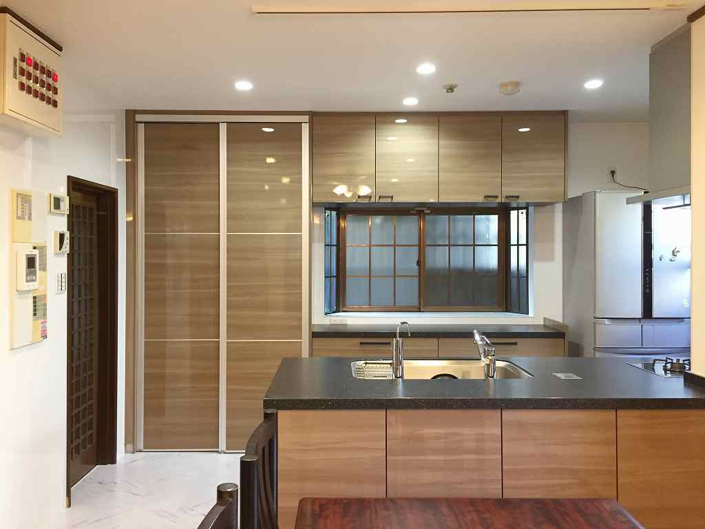 重厚感のあるキッチンの雰囲気はそのままに、キッチン本体とパントリーの交換をしています。ご高齢のお母様でも使いやすいよう、大きなパントリーを設置しました。