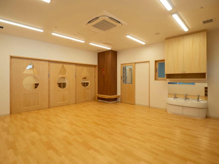 家具や建具はシナ材で製作した物を使用、仕上げはクリアー塗装で行い、保育園内全体に暖かさがある仕上がりとなっております。